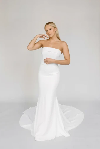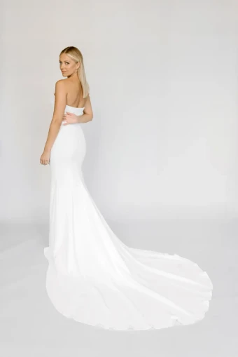Stretch crepe strapless gown with a bias bandeau at neckline, boning for support and a long dramatic train.