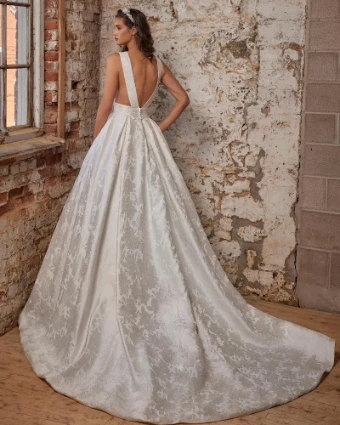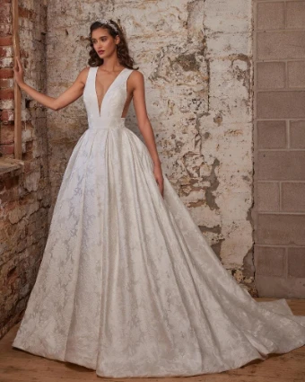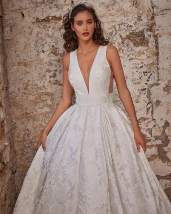 Step into your very own fairy tale while wearing Alicent, the epitome of a classic wedding dress with modern twists. This romantic ball gown is made of unique embroidered satin and features a deep v-plunge neckline and sexy side cut-outs that accentuate your figure. Her daring open back highlights her floral details and the convenience of pockets make this dress both alluring and practical. Say "I do" in style with Alicent and let your wedding day be one for the books.