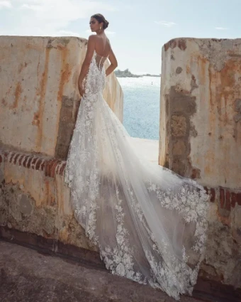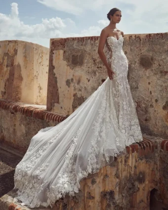 It’s time to believe in happy endings where the woman gets her dream wedding dress that can magically transform. Her 3D lace can be found on her sweetheart neckline, continuing down her side and hip cut-outs, all the way to the hem of her magnificent tulle train. This gown would be perfect for an outdoor summer wedding at a country club.