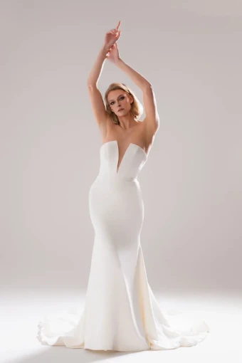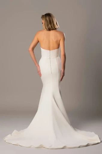 This fit and flare strapless wedding dress features a plunging neckline, structured bodice, and a fabulous open back. The crepe material makes this dress perfect for the minimalist, modern-day bride.