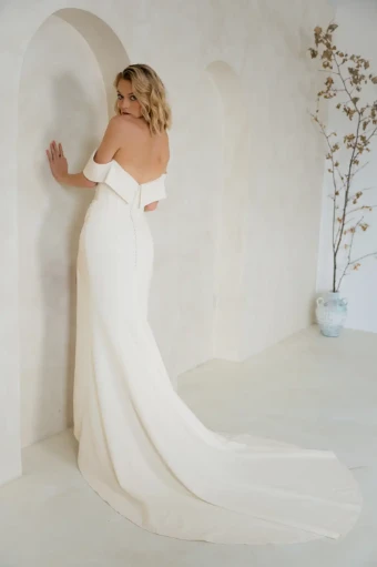 An off the shoulder fitted gown with a sweetheart cross neckline, a structured bodice, and a ruched waist with a wrap side slit.