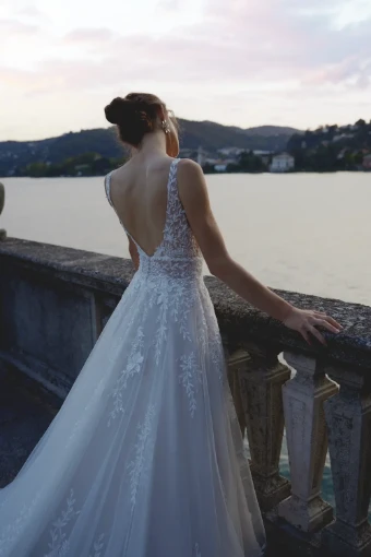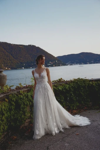 A-line with illusion Sabrina neckline, V-side cutouts, and V-back. Sheer bodice lined with Chantilly lace underlay and waistline is detailed with a beaded cummerbund. Gown embellished with beaded and sequined lace appliques that trickle down skirt. Sequined lace appliques detail hem and chapel length train. Complete with tulle covered buttons on back bodice. Version with bodice lined to side illusion insets available. Raise front or back neckline version available.