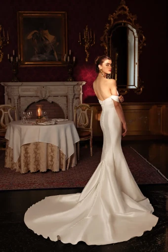 Stretch Mikado fit and flare gown featuring notch neckline and detachable off the shoulder straps. Pleating accents bodice and continues down skirt to reveal a side slit. Box pleated godets detail the chapel length train. Finished with Mikado covered buttons trailing to end of train. Version without skirt slit available.