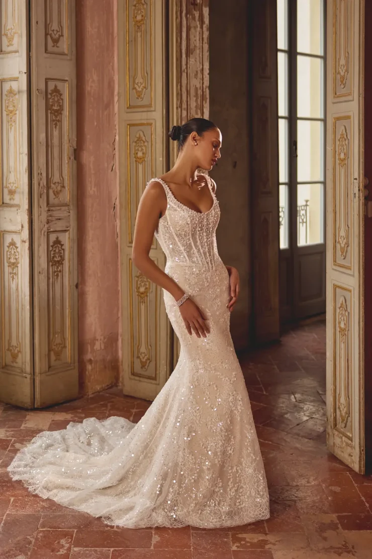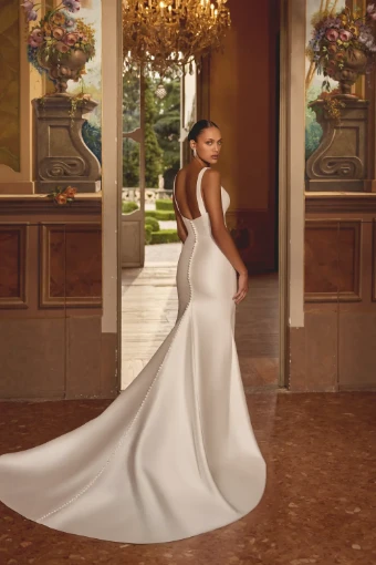 Kassie is a clean stretch mikado fit and flare gown with deep V-neckline. Features inset waistband with modern seaming. Skirt includes side godets and center back godet. Finished with buttons down the chapel length train.