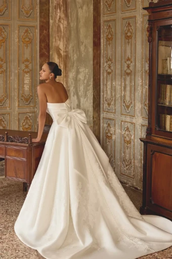 Kaydence is a clean Mikado A-line gown with strapless straight neckline with cuff detail.The skirt includes pockets. Embroidered sequined lace is adorned all throughout the lower part of the skirt above the hemline. Complete with buttons from the back neckline down the chapel length train.