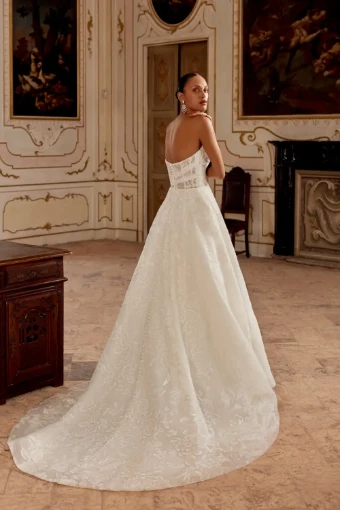 Embroidered crinkled organza A-line gown with strapless cat eye neckline. Illusion bodice reveals exposed boning beneath pleated detailing. Skirt includes knife pleats that reveal a side slit.