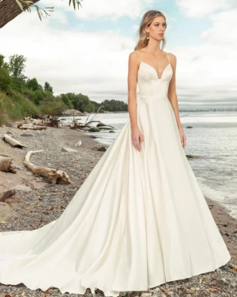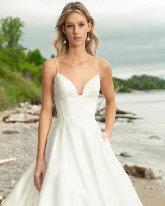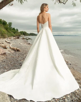 Aida proves that understated is never overrated! Her simple, satin A-line silhouette is not only a dream for the classic bride, her voluminous train with eye catching button details that trail along is perfect for making a grand entrance. Not to mention, her dainty spaghetti straps and a v-neckline add a touch of sophistication and grace making Aida perfect for a modern day princess! Did we mention that she has pockets?!