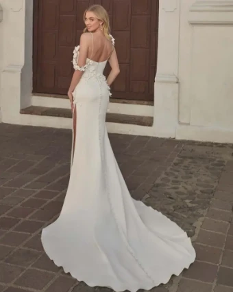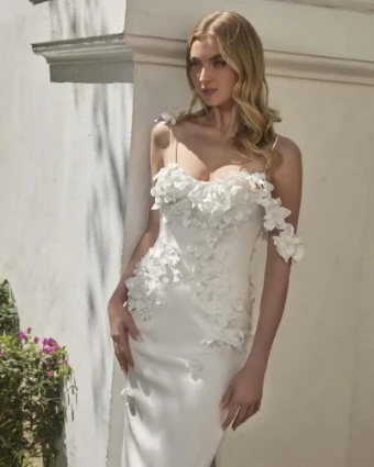 Inspired by the beauty of nature, Ivanna is a satin sheath wedding dress adorned with intricately crafted floral appliqués that cascade down the bodice and skirt, creating a dreamy, romantic look. A daring thigh-high slit adds a playful twist and perfectly balances sexy and refined. Her off-the-shoulder floral detail and delicate spaghetti straps expertly bring attention to your collarbone, adding to the gown's ethereal appeal. Ivanna is perfect for the bride who wants to float down the aisle with angelic grace but isn't afraid to show a bit of sass.