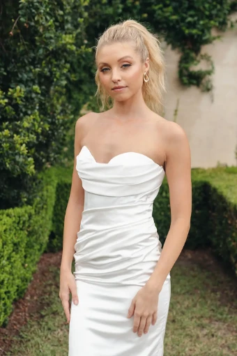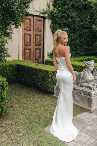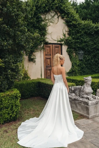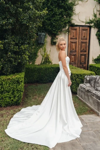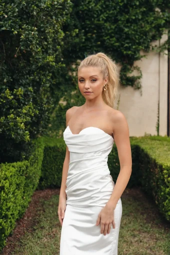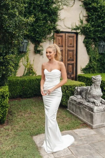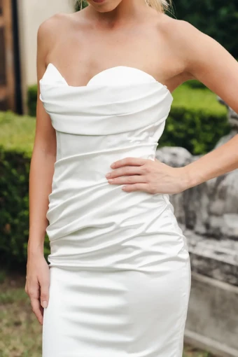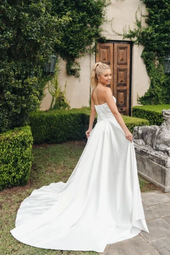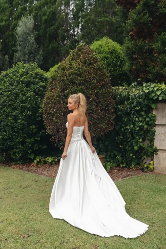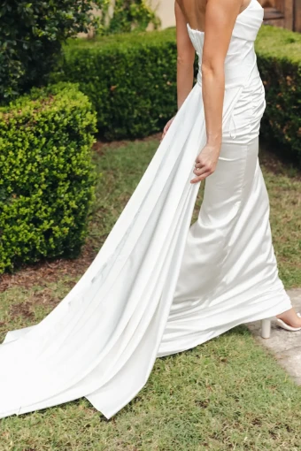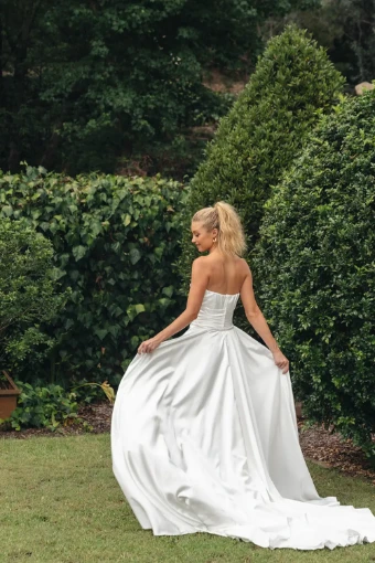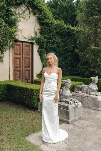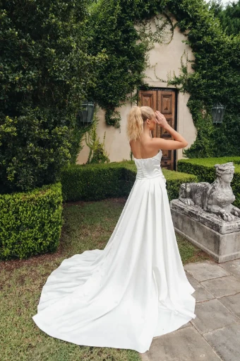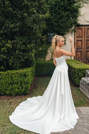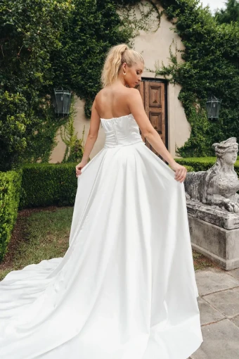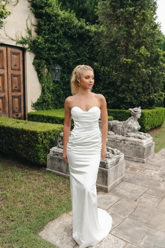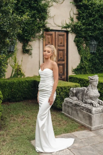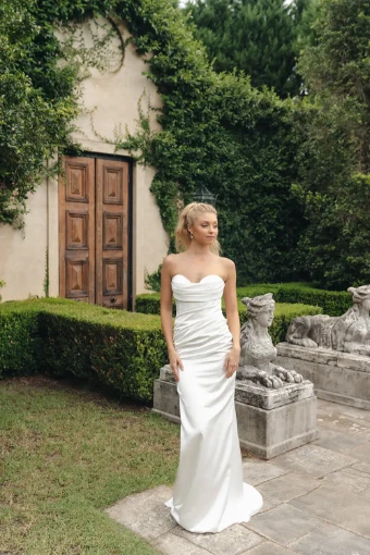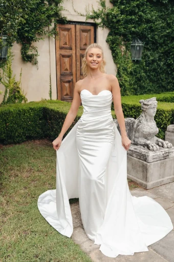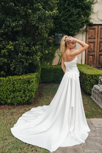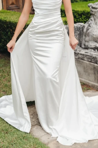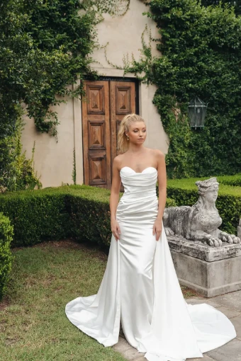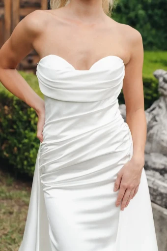London is a strapless satin mermaid dress featuring pleats at the bust and hips, complemented by a satin overskirt that enhances the train's volume.