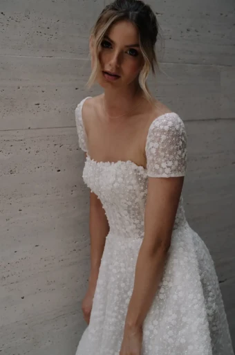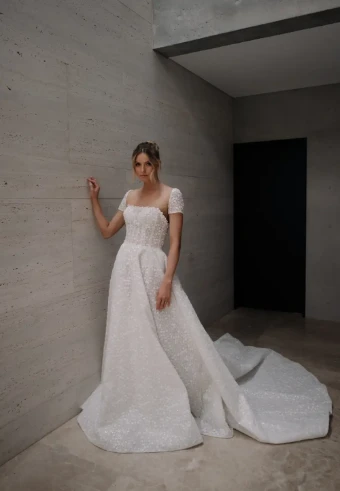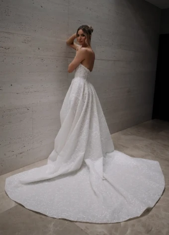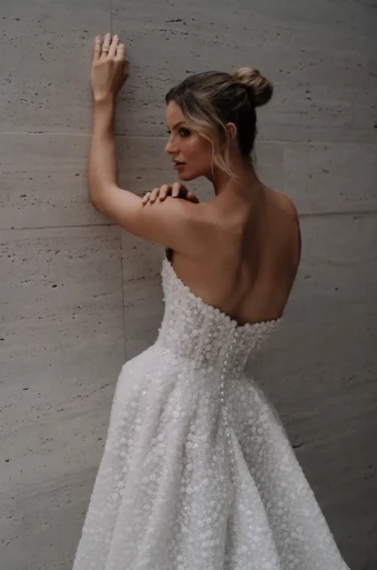 Introducing Rio: a simple yet elegant strapless gown. The bodice features a structured design that perfectly shapes and accentuates the bride's waist, adding an element of sophistication and grandeur. The A-line skirt with a long train is a timeless silhouette that flatters every bride. Delicate floral patterns evoke the beauty of spring blooms, infusing Rio with vitality and romance. With a detachable jacket, the bride transforms into a fairy-tale figure—beautiful, pure, and captivating—ensuring she is the center of attention on her special day.