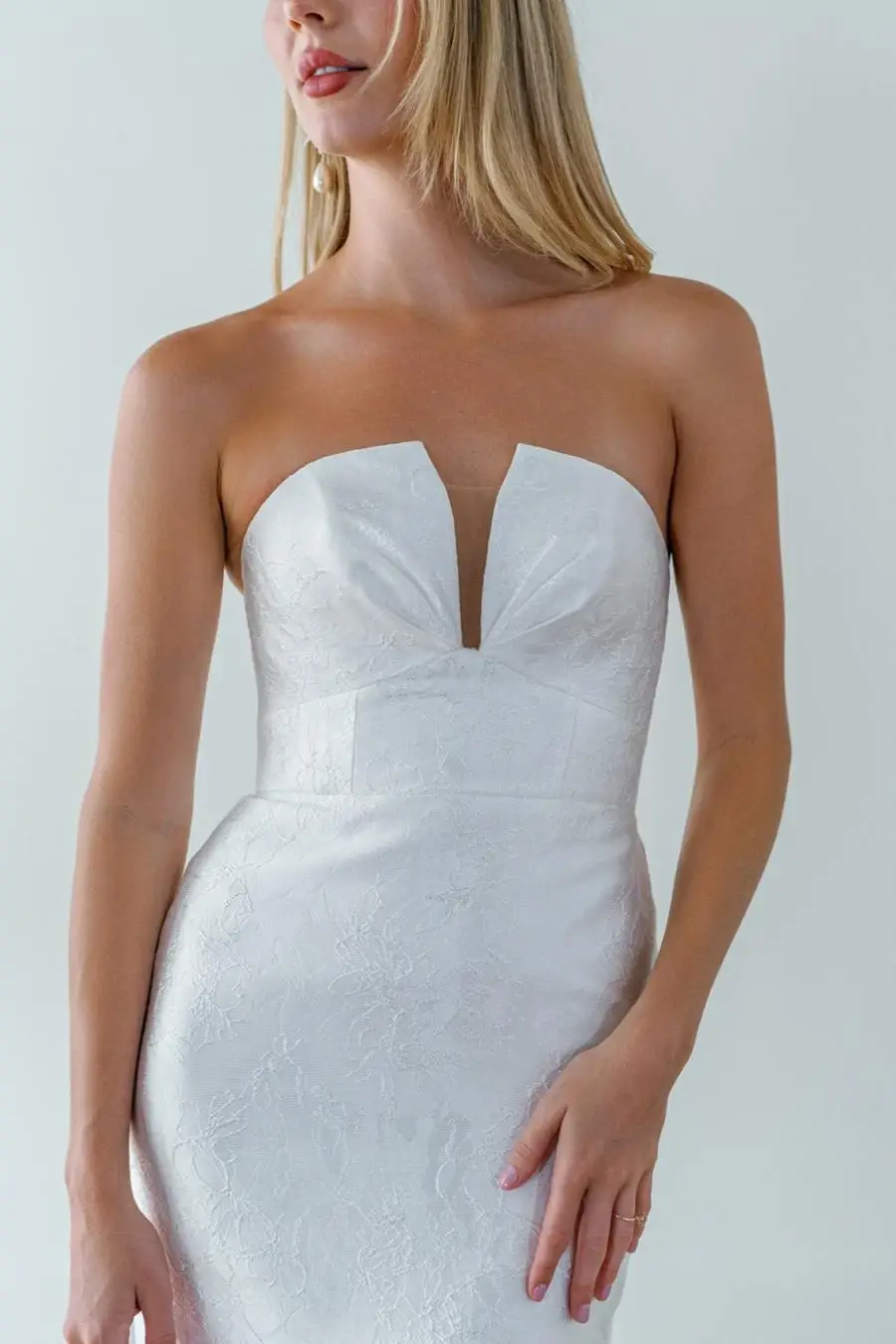 The Noor gown – a masterpiece of elegance and allure. Crafted from our Jingle Jacquard fabric, and fitted to accentuate your silhouette. It's notched neckline adds a touch of modern sophistication. Adorned with a trail of self-covered buttons cascading down the back, this gown is a harmonious blend of tradition and contemporary design.