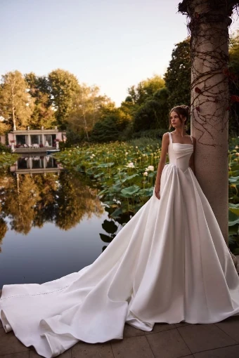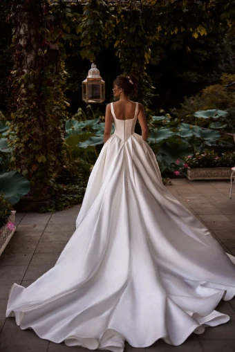Cinderella wedding gown crafted from luxurious mikado in a princess silhouette. Featuring a fitted bodice with delicate draping along the straight neckline and subtle straps designed to suit all bust types while offering optimal support. The back is elegantly closed with a hidden zip and adorned with decorative buttons. The full, pleated skirt adds volume and drama, making it ideal for a grand bridal entrance.