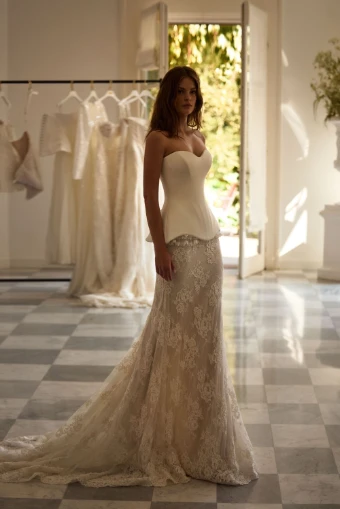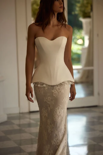 Chic drop-waist corset made of sleek satin, featuring a flattering heart-shaped neckline, hidden boning and structured fit that elongates the silhouette and flatters the waistline, and a lace-up closure on the back that adds a regal touch.