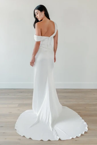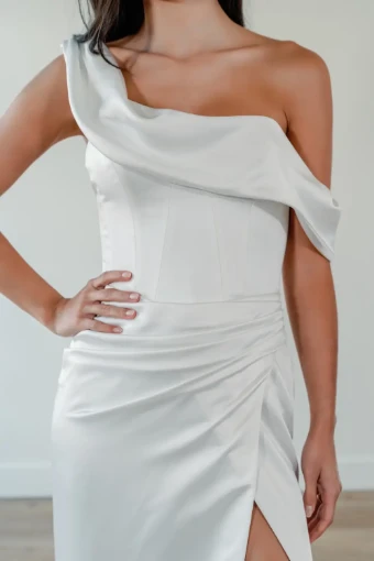 Introducing the exquisite Jesse wedding dress, a captivating embodiment of grace and modernity. Crafted from luxurious Che Charmeuse fabric, this sheath-style gown boasts a timeless silhouette that effortlessly complements every curve. The draped one-shoulder cowl neck exudes sophistication, while the alluring side slit and ruched skirt add a touch of daring romance, making Jesse the perfect choice for the contemporary bride seeking both elegance and allure on her special day.